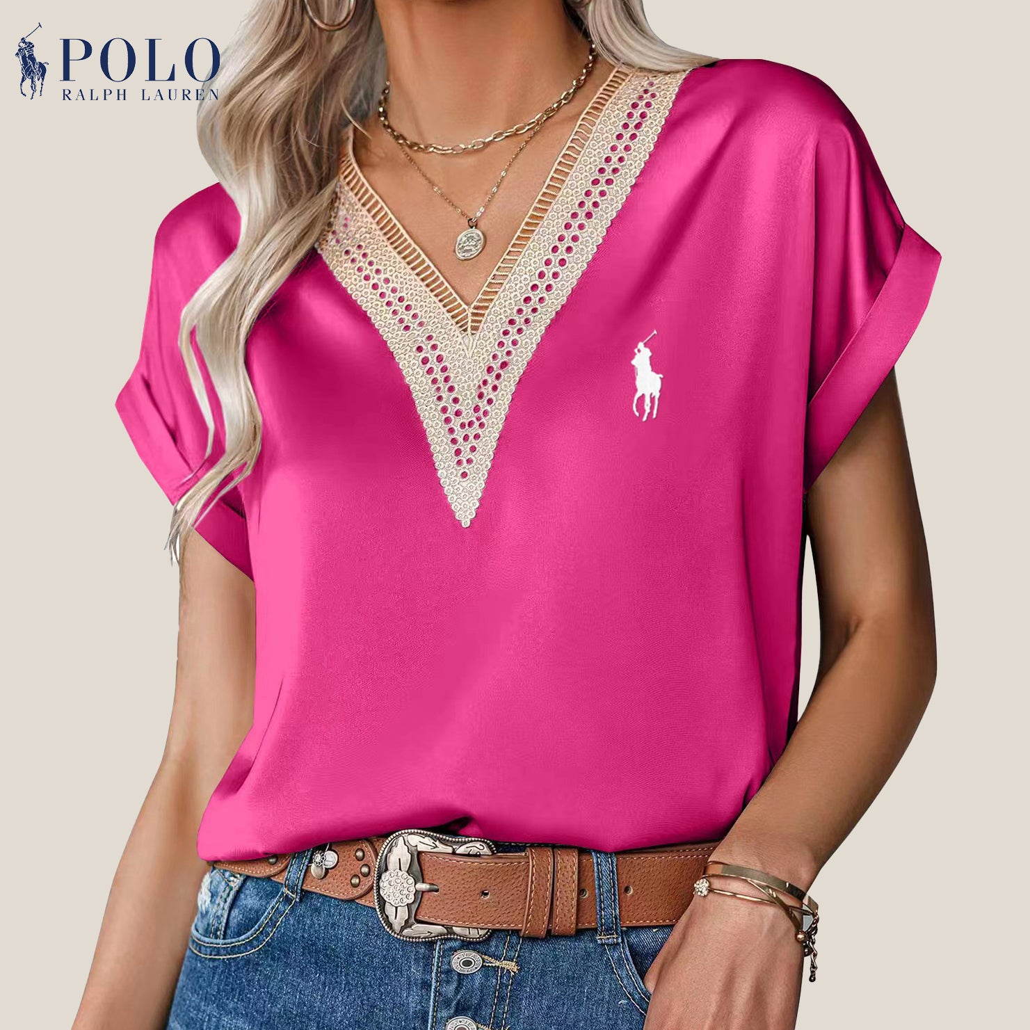 Crafted from soft, breathable fabrics, this Ralph Lauren – Lace Satin V-Neck Blouse is perfect for a casual or elegant look. Whether it’s a casual outing, a dressy evening or a day at work, this Polo RL shirt adapts to any situation. Pair it with jeans for a casual look or with elegant trousers for a more sophisticated style.