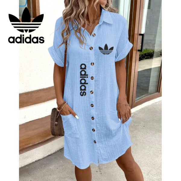 Step into casual chic with this Adidas – New Summer Dress that blends comfort with iconic branding. Designed in a relaxed fit with rolled sleeves and a button-down front, this dress is the perfect companion for days when you want to look put-together without trying too hard.